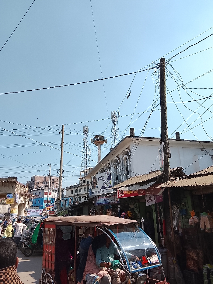 A busy street scene shows rickshaws and people moving along a road lined with shops. Overhead, a tangle of electrical wires runs above the buildings and a utility pole. In the background, telecommunication towers and a light-colored building with arched windows rise above the commercial establishments. The sky is clear and blue.