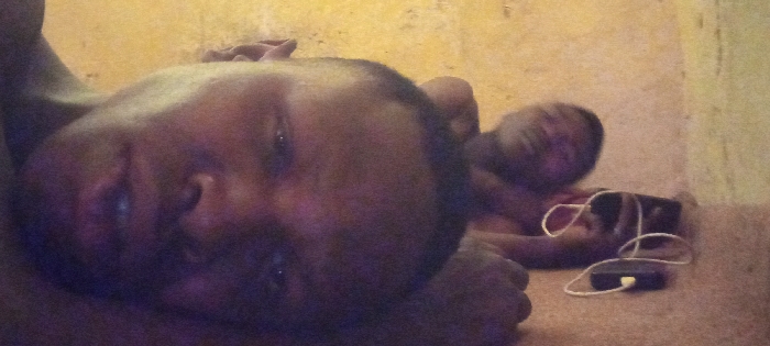 This image depicts two dark-skinned individuals within an interior space, location Unknown, Unknown. The primary subject, in the foreground on the left, is oriented with their head tilted left, eyes directed towards the camera. A second individual is partially visible in the mid-ground on the right, also in a reclined or resting posture. Adjacent to the second individual, a dark rectangular device, consistent with a smartphone, is connected by a white cable to a smaller dark rectangular power source. The immediate background consists of a textured, light brown surface, likely a wall or floor. The scene is dimly lit, contributing to visible image noise.