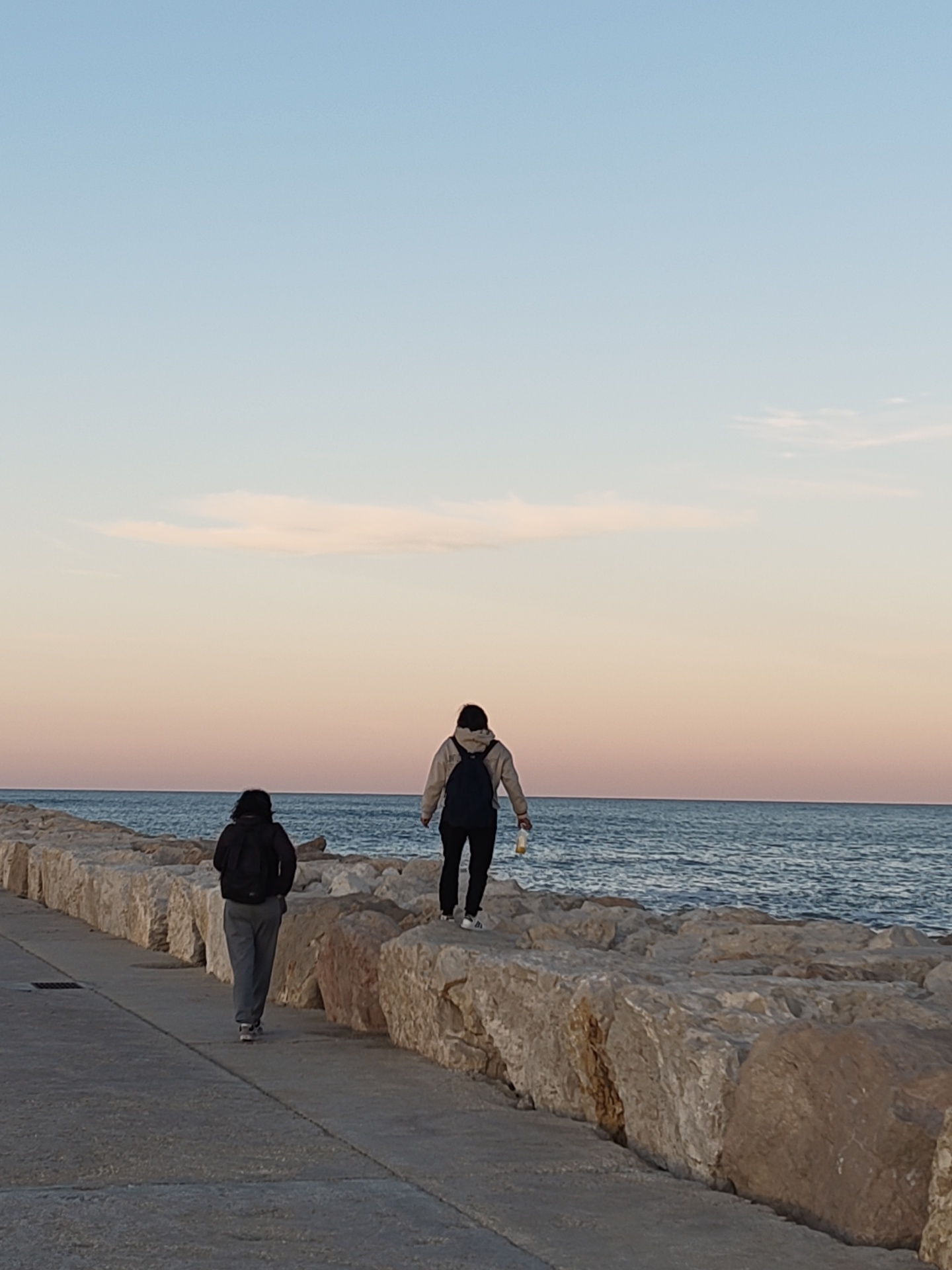 Two people are seen from behind in Dénia, Spain, on a structure near the sea. One person walks on a concrete path near the water, wearing a dark jacket, gray pants, and a backpack. The other person is walking on a large rock formation, wearing a light jacket, black pants, and a backpack, holding a light-colored object in one hand. The sea stretches out behind them, and the sky is a gradient of blue and pink from the sunset.