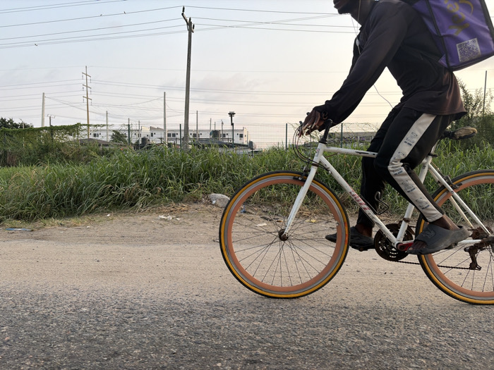 A person rides a white bicycle on a paved road. The rider wears dark clothing and a large backpack. Tall green grasses grow along the roadside, and a fence separates the road from buildings in the background. Utility poles and power lines stretch across the sky. The lighting suggests early morning or late afternoon. The composition focuses on the cyclist in motion.