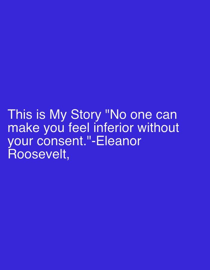 The image displays white, sans-serif text against a solid royal blue background. The text is left-aligned and positioned in the lower-middle section of the frame. The content reads: "This is My Story "No one can make you feel inferior without your consent." -Eleanor Roosevelt,". The scene is a purely graphic presentation of text; no discernible physical location or environmental details, including any specific area within Reigate and Banstead, United Kingdom, are depicted. No individuals, objects other than the text, or actions are present.