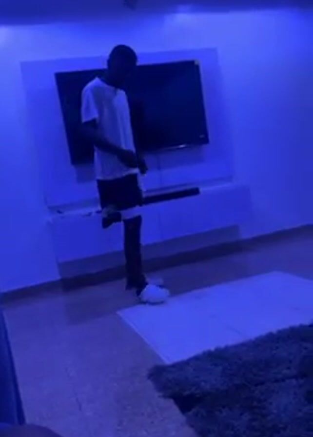 A man in a white shirt, black shorts with a white stripe, and white clogs walks around a living room bathed in blue light