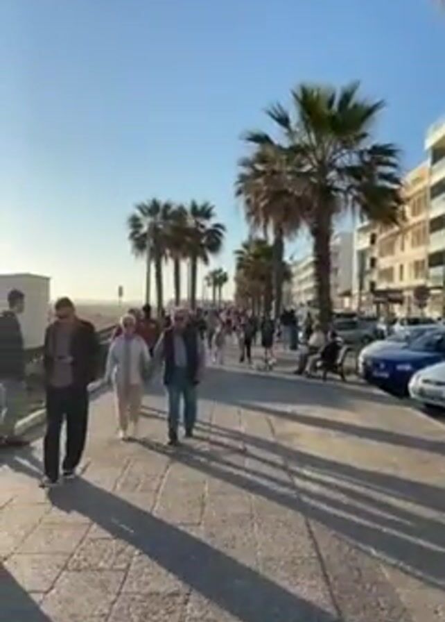bright, sunny day on a seaside promenade. People of various ages stroll along the paved walkway, lined with palm trees and multi-story buildings. Cars are parked along the road adjacent to the promenade. A few people are on the beach, and the ocean is visible in the background. In one part of the video, a person wearing athletic gear is running on the promenade, seemingly jogging.