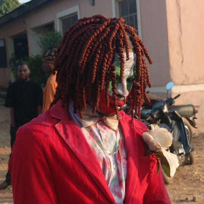 A person dressed as the Joker stands in front of a building and a motorcycle. They are wearing a red suit, a pale patterned shirt, and a tan bowtie. The Joker's face paint is visible, with green and white makeup. They have brown braided hair and a white flower pinned to the jacket. In the background, two other people stand near the building.