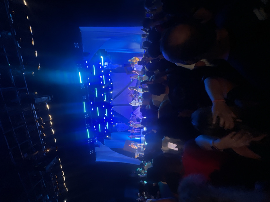 A low-angle shot captures a concert scene. A brightly lit stage, illuminated with blue lights, features several performers. A large crowd is visible in the foreground, their forms blurred and indistinct. Many people are holding up phones, recording the performance. The atmosphere is dark, with the stage lights providing the primary source of illumination. A lighting rig is on the far left.