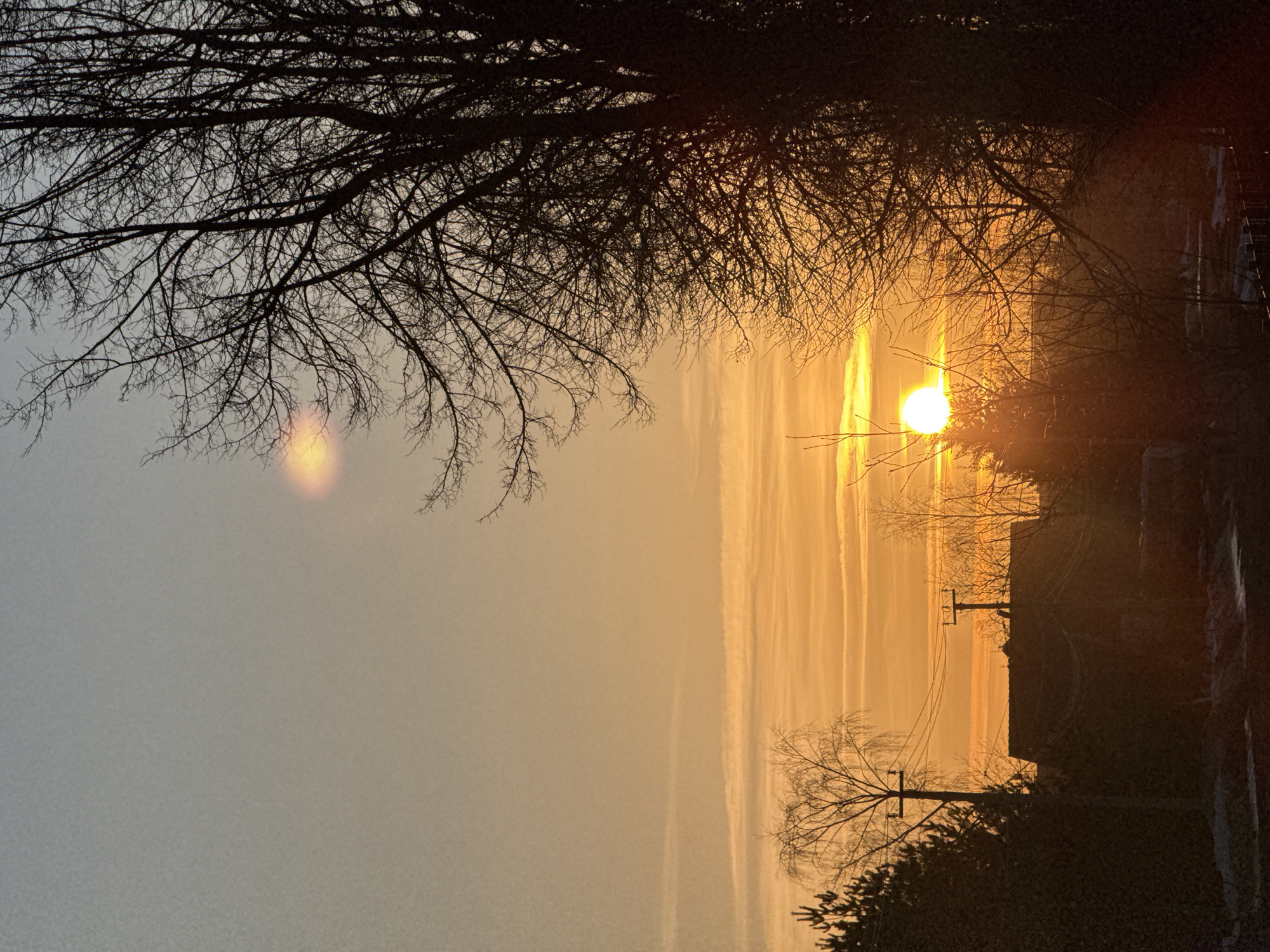 The image depicts an outdoor scene at sunrise or sunset in Bol'shie Mkhi, Russia. The sun, a prominent bright white-yellow orb, is positioned low on the horizon in the lower right quadrant, casting an intense orange-yellow hue across the lower sky that gradually transitions to a muted blue-grey towards the zenith. Horizontal cloud formations are visible in the mid-sky. Numerous leafless deciduous trees and a cluster of coniferous trees are silhouetted against the illuminated sky, with a dense mass of bare branches dominating the right side of the frame. Utility poles with overhead power lines are visible extending horizontally across the mid-ground. A residential structure with a gabled roofline is partially visible in silhouette below the horizon, situated in the center-left mid-ground. The foreground ground cover shows patches of snow. No human or animal figures are discernible. A distinct circular lens flare or atmospheric light phenomenon with yellow-orange characteristics is present in the upper-left quadrant of the sky.