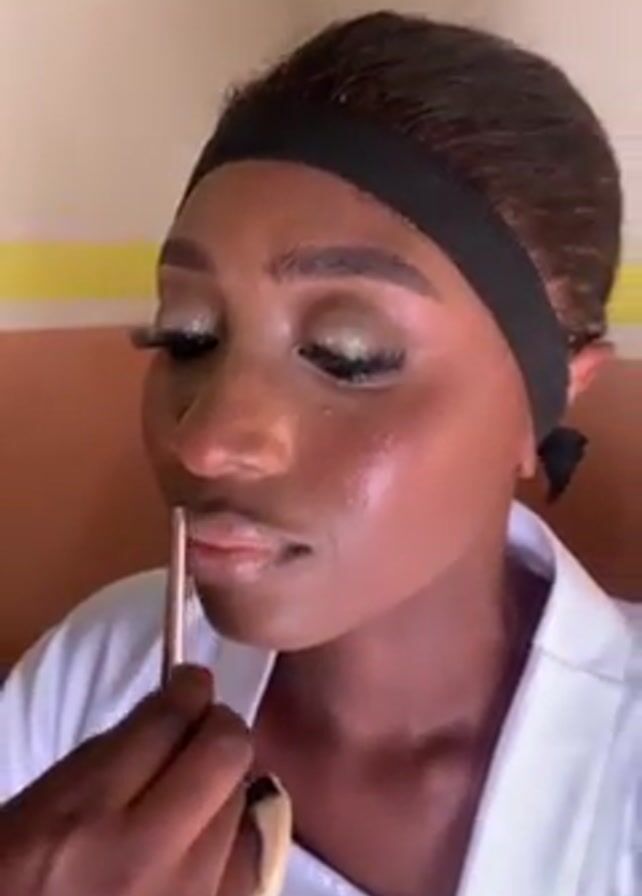 A close-up video shows a person applying lip makeup to another person's lips. The person receiving the makeup is a woman with dark skin wearing a black headband and white robe. She has full makeup on, including eyeshadow, fake eyelashes, and blush. The person applying the makeup is not fully visible, but their hand is shown holding a brush. The background consists of a wall with a yellow stripe at the top.