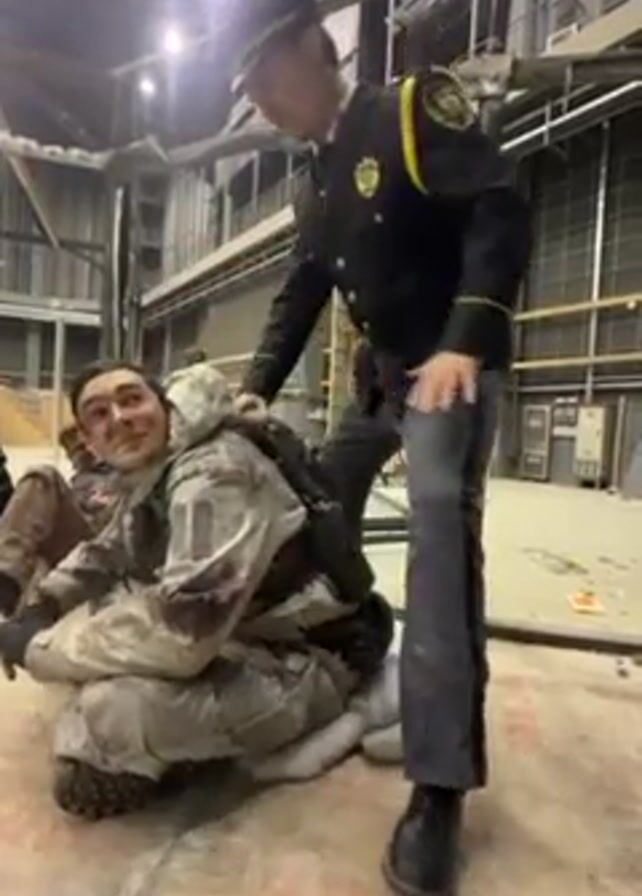 A man in a police uniform is standing over a man in a camouflage uniform who is sitting on the floor