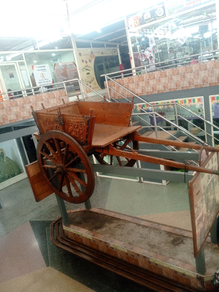 The image depicts an interior scene within a multi-level commercial establishment located in Tinaquillo, Venezuela. The primary subject is a large, intricately carved wooden cart, positioned on an elevated display structure. This antique-style cart features detailed relief carvings along its side panels and is equipped with two prominent wooden spoked wheels. The cart's display platform includes a rectangular, tiled planter-like element extending from its base, and an upright display board with images and text situated to its immediate right. In the background, an upper floor of the building is visible, characterized by multiple glass-fronted businesses. Prominently displayed is "ACADEMIA VALENCIA," identified by its signage and a logo resembling an eye, indicating an institution offering beauty-related courses. Other businesses on this level also appear to offer similar services, as indicated by visible advertisements for "Cursos y Talleres" concerning eyebrows and makeup. A tiled staircase with stainless steel handrails provides access between the visible levels. The lower floor, visible beneath the display and staircase, features a multi-toned geometric tile pattern in shades of gray, light blue, and beige. Several indistinct human figures are discernible through the glass facades of the upper-level shops, but no specific actions or interactions are clearly identifiable. No individuals are directly interacting with the displayed cart. The environment is brightly illuminated by overhead artificial lighting, resulting in noticeable lens flare and reflections, particularly in the upper right quadrant of the image.