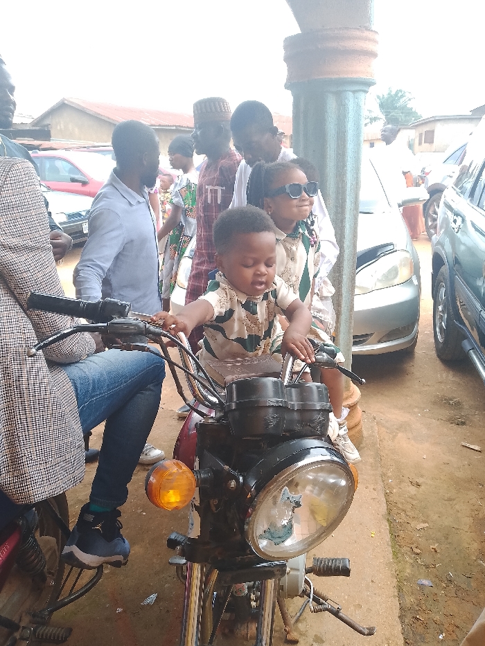 In Television, Nigeria, a toddler wearing a cream and green patterned short-sleeved top is seated on the front portion of a dark-colored motorcycle, hands gripping the handlebars, looking downwards