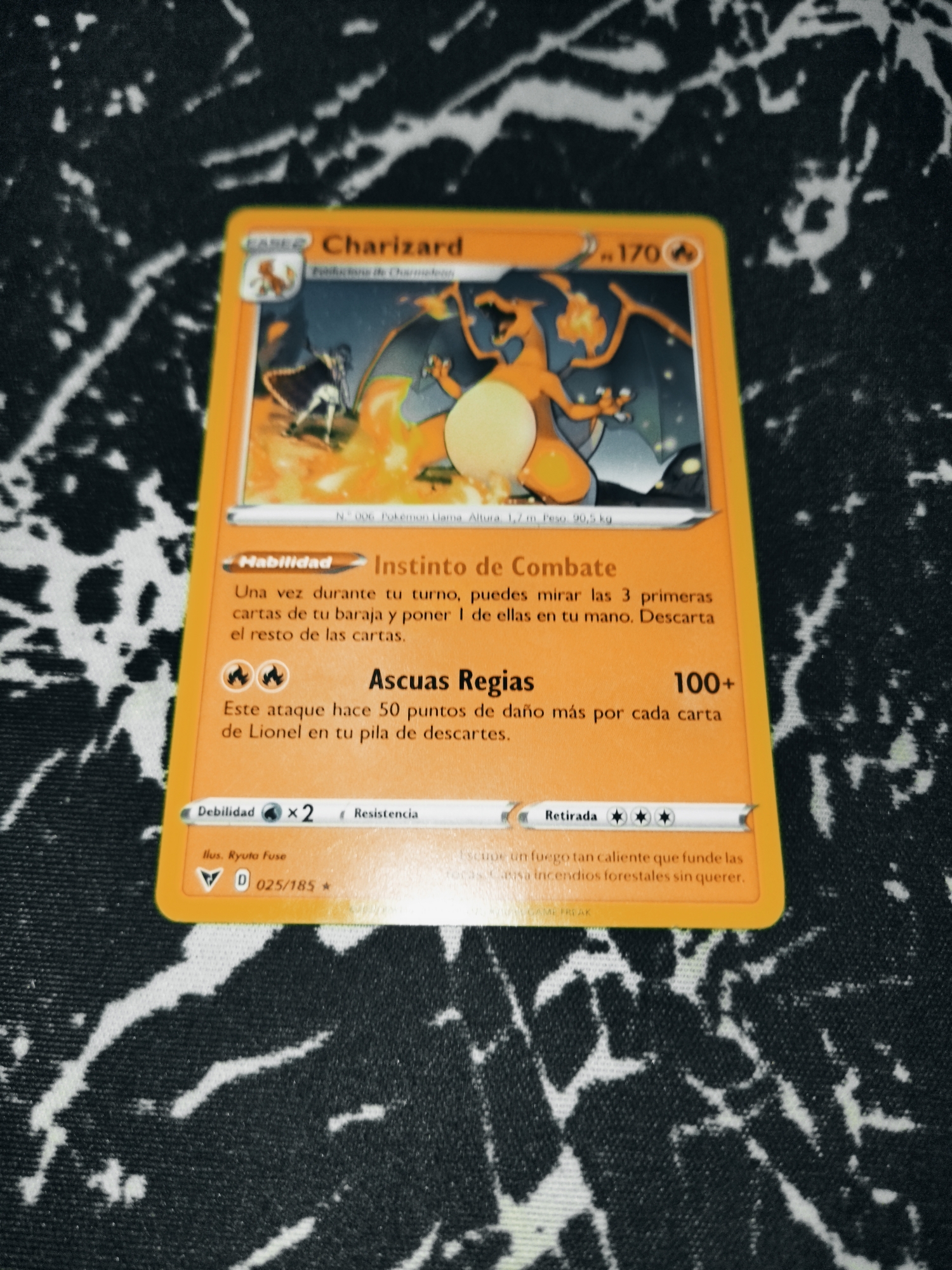 Charizard Pokémon card. The card is primarily orange and yellow in color with an illustration of Charizard in a dynamic pose. The card details include HP 170, the name "Charizard" and "Evoluciona de Charmeleon". The text on the card is in Spanish, detailing its abilities ("Instinto de Combate") and attacks ("Ascuas Regias"). The card also includes information about its weakness (x2), resistance, and retreat cost. The card's set and number, "D 025/185," are visible at the bottom. The card appears to be sitting on a surface with a black and white marble-like pattern. There is no mention of Tinaquillo, Venezuela, or any specific location in the image.