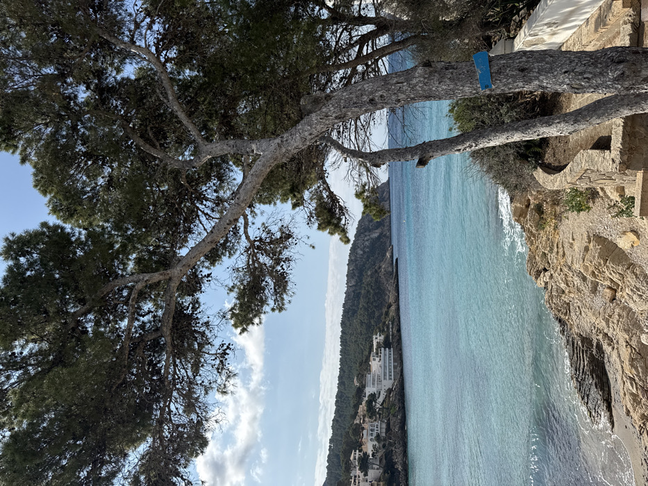 The scene depicts a coastal bay in the city of Andratx, Spain, under a partly cloudy sky. In the foreground, a large pine tree with a greyish-white trunk and dark green foliage occupies the right side, extending its branches across the upper frame. A small, rectangular blue marker is affixed to the trunk of this tree. To the right of the tree, a stone retaining wall and a curved path are visible. The midground features a rocky shoreline with patches of sand, transitioning into clear, turquoise-blue water with minimal wave activity. On the left side of the bay, multiple white, multi-story buildings with flat or low-pitched roofs are situated on a forested hillside. One prominent white structure is located near the water's edge. The background consists of densely vegetated hillsides bordering the bay, with a distant headland extending into the sea. No individuals or specific actions are discernible within the frame.