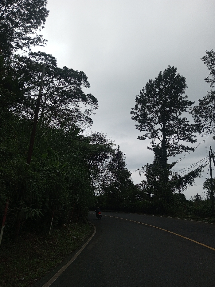 The image depicts a winding asphalt road cutting through a densely vegetated, hilly landscape under an overcast sky in Domphoog_Dungkarchhoeling, Bhutan. The road, dark in tone, curves rightward in the mid-ground and features a continuous yellow center line and a solid white shoulder line on the left. A lone individual on a motorcycle, wearing dark attire, is observed traveling away from the viewer on the road, identifiable by a red taillight. To the left of the road, a steep embankment is covered in thick, dark green foliage, including tall grasses and various deciduous trees. A dark utility pole stands vertically on this side, with white and red markers near its base. To the right of the road, the landscape is dominated by dense, dark tree canopies silhouetted against the grey sky, including a prominent tall, slender tree with a distinct crown. Another utility pole, connected by multiple dark overhead wires, is visible on the upper right, with some wires appearing to intermingle with tree branches. The sky above is uniformly light grey, indicative of overcast conditions, providing diffuse, even illumination to the scene.