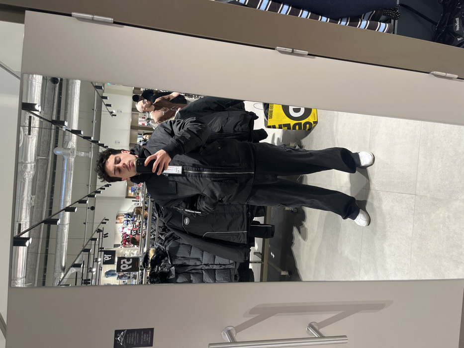 A male subject is observed in a mirror selfie taken within a retail clothing establishment in Mundolsheim, France