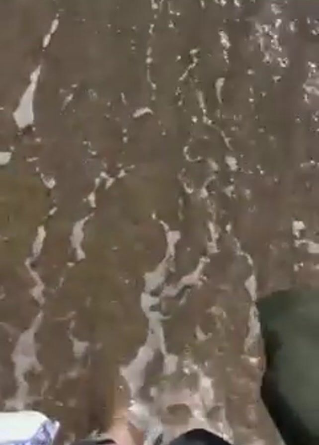 first-person perspective from someone standing on a beach. The individual is barefoot and wearing what appears to be a dark-colored pair of shorts. Ocean waves wash over their feet and the sand. To the right, they carry a green object and to the left a white and blue patterned cloth.