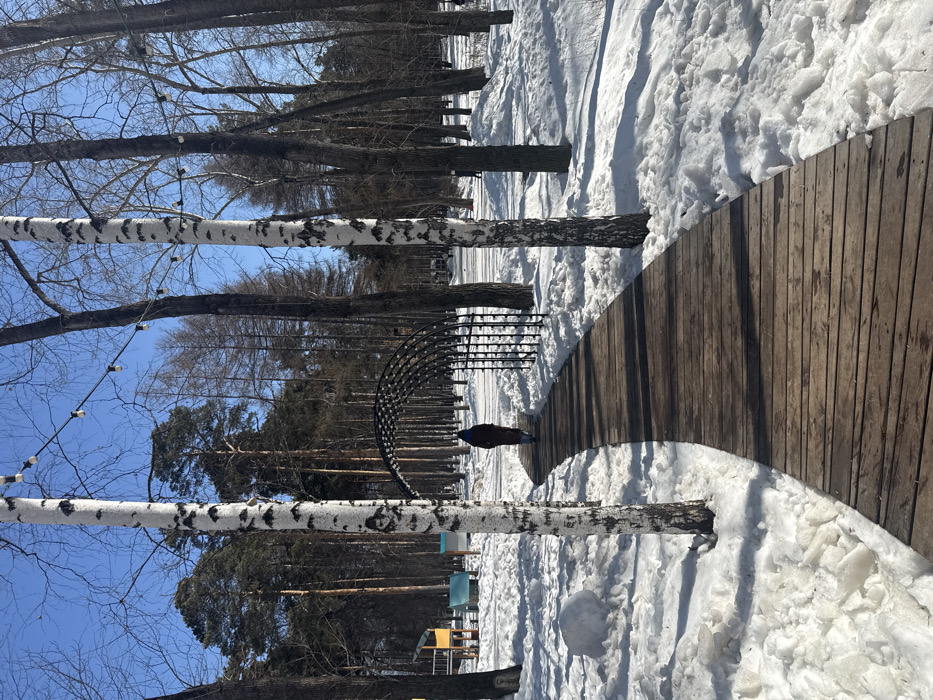 The image displays a winter scene within the Dendropark in Yekaterinburg, Russia. A wooden boardwalk path, constructed from horizontal planks, extends from the foreground towards the midground, where it passes under a dark metal archway adorned with multiple small white lights. This archway is part of a larger, illuminated tunnel structure. The ground on either side of the path is covered in white snow, displaying various textures from undisturbed drifts to compacted, possibly icy patches. Numerous trees, including slender birches with characteristic white and black bark and darker coniferous trees, populate the environment. Many deciduous trees are bare of leaves. Overhead, string lights with exposed bulbs are suspended between the trees. The sky is clear and blue, indicating a bright, sunny day. A single individual is visible walking away from the viewer on the wooden path, moving towards and under the illuminated archway. This person is wearing a long, dark-colored coat, a dark blue or purple hood, and light-colored shoes. In the far left background, partially obscured by trees, a children's playground structure with yellow, blue, and green elements can be discerned. Long shadows are cast across the path and snow, consistent with a low sun angle.