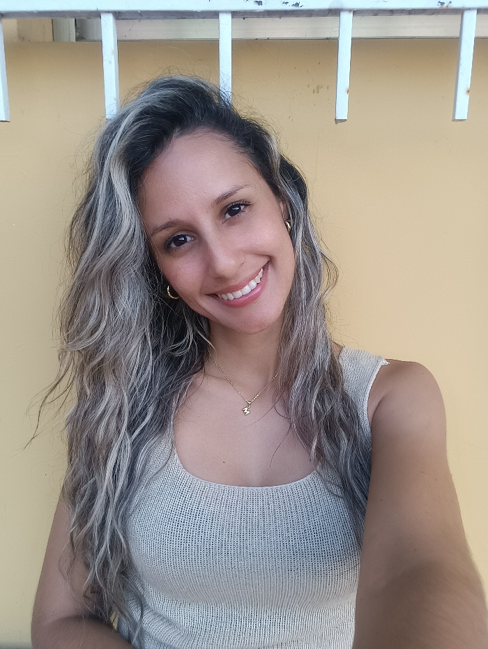 An adult female is depicted in a medium shot, facing the camera with a direct gaze and a wide smile, revealing her upper teeth. She has long, wavy hair exhibiting a dark root growth transitioning into ash-blonde or greyish-blonde lengths, extending over her shoulders. She wears a light-colored, possibly beige or off-white, ribbed knit tank top with a square neckline. Accessory details include small gold-colored hoop earrings in both ears and a thin gold-colored necklace with a small, stylized bear-shaped pendant. The background consists of a plain light yellow wall, with a white, somewhat weathered metal grille structure visible at the top of the frame, featuring horizontal and vertical bars. The scene is located in Trapiche del Medio, Venezuela.