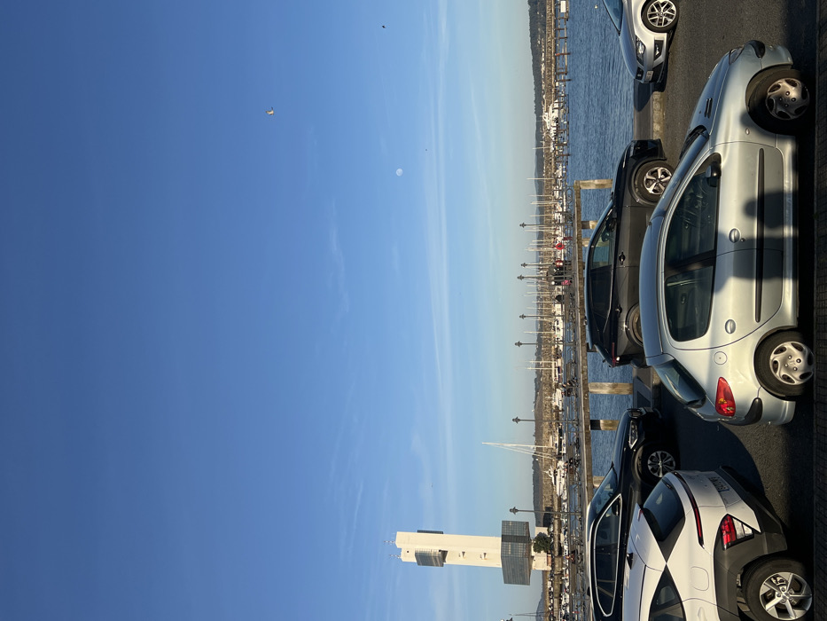 The image depicts a marina scene in La Coruña, Spain, characterized by a clear blue sky with minimal cloud cover. The white "Torre de Control Marítimo de A Coruña" is prominent on the left, a multi-story, angular white structure with dark glass panels. A bright, nearly full moon is visible in the upper center-right sky, and several small birds are in flight. In the foreground, four vehicles are parked along what appears to be a paved waterfront area. From left to right: a white compact SUV with black trim, a black SUV, and a silver two-door hatchback are clearly visible. The front portion of a silver sedan is partially visible on the far right. Shadows from the cars and unseen foreground objects extend towards the lower right, indicating a high sun position. Beyond the parked cars, a body of water—the marina—is populated by numerous sailboats and powerboats docked at piers. A long wooden or concrete pier with multiple streetlights extends across the mid-ground, supporting various parked bicycles and a few small groups of individuals walking or standing. The background features distant landforms, likely hills, under the bright sky. No specific interactions between people are clearly discernible, but their presence suggests recreational activity. The overall impression is one of a clear, bright day at a busy port.