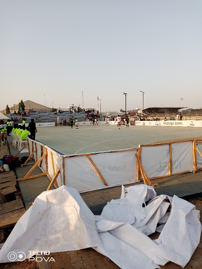 An outdoor futsal court during a game with spectators in the stands. The court is surrounded by wooden barriers covered in white tarpaulin, some of which is crumpled in the foreground. Players in black and white uniforms are visible on the court. The scene is bathed in warm sunlight, suggesting it's either early morning or late afternoon. A logo is visible on the bottom left corner, indicating the image was taken with a Tecno Pova device.