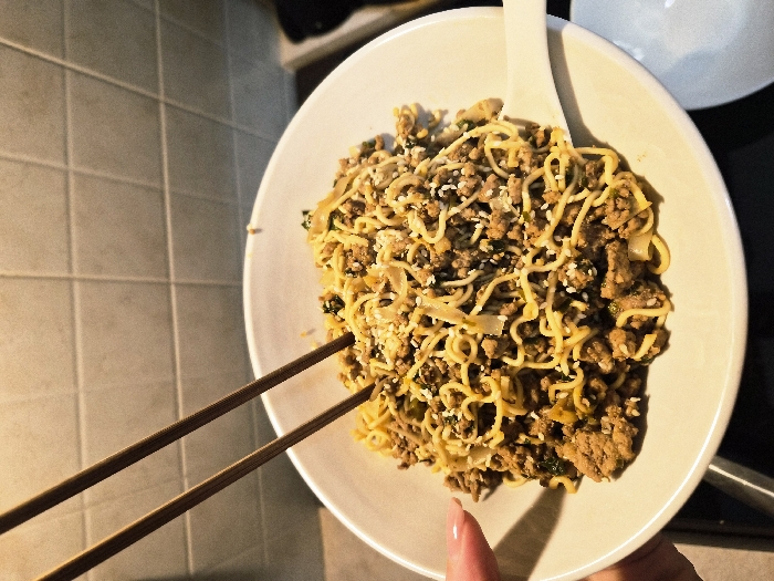 The image depicts a close-up view of a bowl of food, held by a person's hand, within an indoor setting. The specific location within the Municipal Unit of Corinth, Greece, cannot be determined from the visual information provided. The primary subject is a large, light-colored ceramic bowl filled with a meal composed of yellow curly noodles, brown granular ground meat, green leafy components, and white sesame seeds sprinkled throughout. Two brown chopsticks are inserted vertically into the center of the meal. A white ceramic spoon rests on the right rim of the bowl. A human hand, with a pink-painted fingernail on the index finger, is visible on the lower left, gripping the exterior of the bowl. The background features a light-colored tiled wall, likely a kitchen backsplash, with visible grout lines forming a grid pattern. Below the bowl, on the left, a dark, indistinct surface is present. On the lower right, a portion of a smaller, white ceramic dish or bowl is visible. Illumination appears to be artificial, casting some subtle shadows.