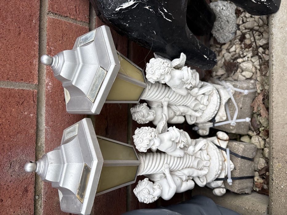 Two weathered, silver-painted solar garden lanterns, each with a hexagonal top and amber-tinted panels, stand against a red-brown brick wall in Minsterley, United Kingdom. Each lantern is supported by a white, ornate pedestal featuring multiple cherub-like figures in various poses. The bases of these pedestals are secured to rough concrete blocks or stones using zip ties: black zip ties for the left pedestal and white zip ties for the right. The ground beneath consists of light-colored gravel mixed with dried leaves. A portion of a dark, irregular object, possibly another garden ornament, is visible to the right of the second lantern. A concrete edge forms the immediate foreground. No people are present.