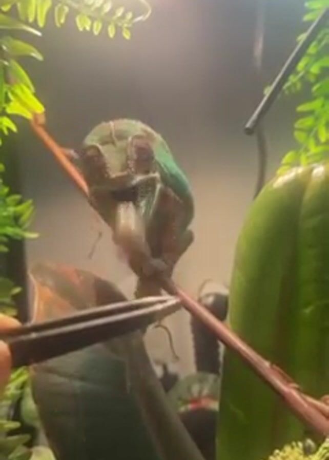 A chameleon is perched on a branch inside a terrarium. A person is holding a pair of tweezers near the chameleon’s face. The chameleon is teal and red. The terrarium contains artificial plants. A light is above the terrarium.