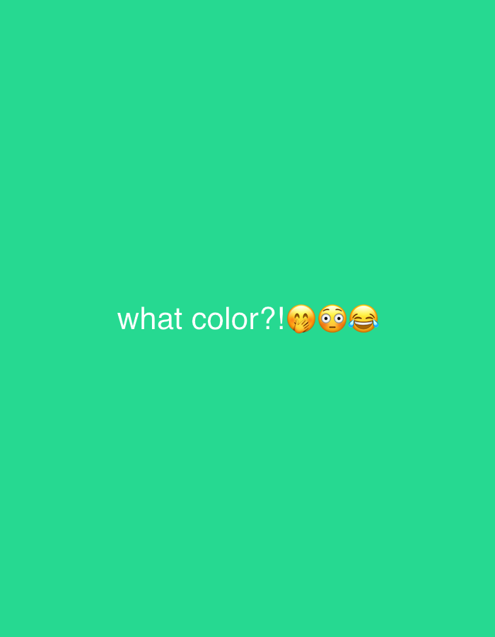 The image displays a uniform, solid light green background. White text reading "what color?!" is horizontally centered in the lower-middle portion of the frame. To the immediate right of this text, three emojis are present: a face with hands covering its mouth, a face with wide-open eyes, and a face crying tears of joy. The scene is located in Mensdorf, Luxembourg.