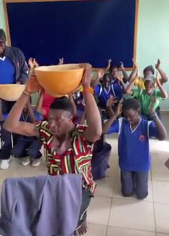 In a brightly lit classroom, an adult male wearing a brightly colored shirt and black shorts is moving to music with a large, light-colored, gourd-like bowl balanced on his head. He is surrounded by children wearing blue uniforms, most of whom are kneeling with their hands raised. Some of the children have similar bowls on their heads. One child in the background is standing. The room has green and white walls, a dark blue bulletin board, a clock, and a desk.