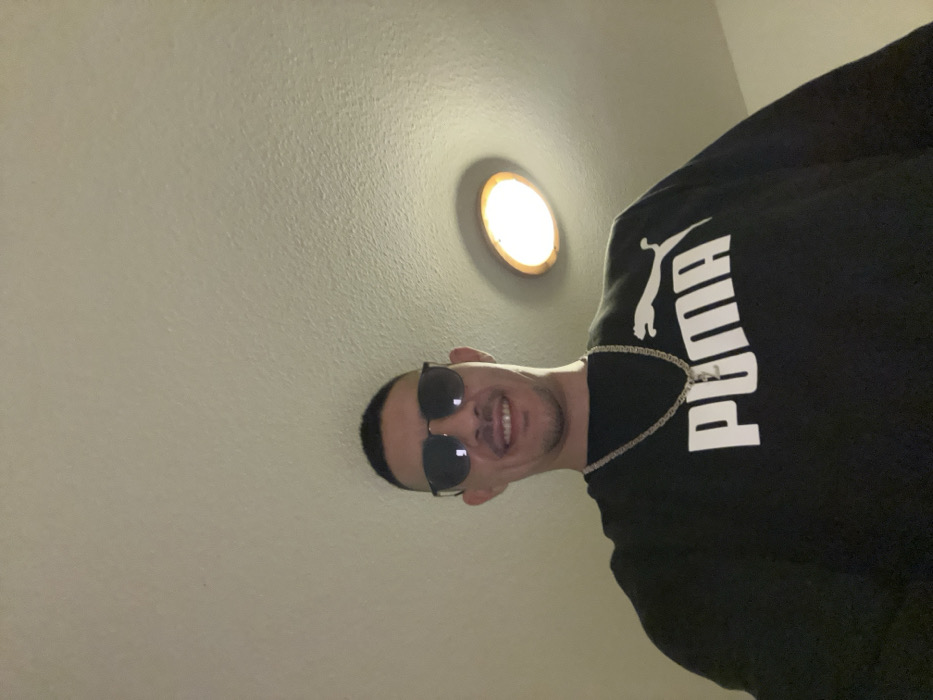 A man wearing sunglasses and a black Puma sweatshirt looks down at the camera with a slight smile. He sports a silver chain. The background consists of a plain, textured wall and a circular light fixture. The image is taken from a low angle, looking up at the subject. The lighting is somewhat dim, creating shadows on the wall.