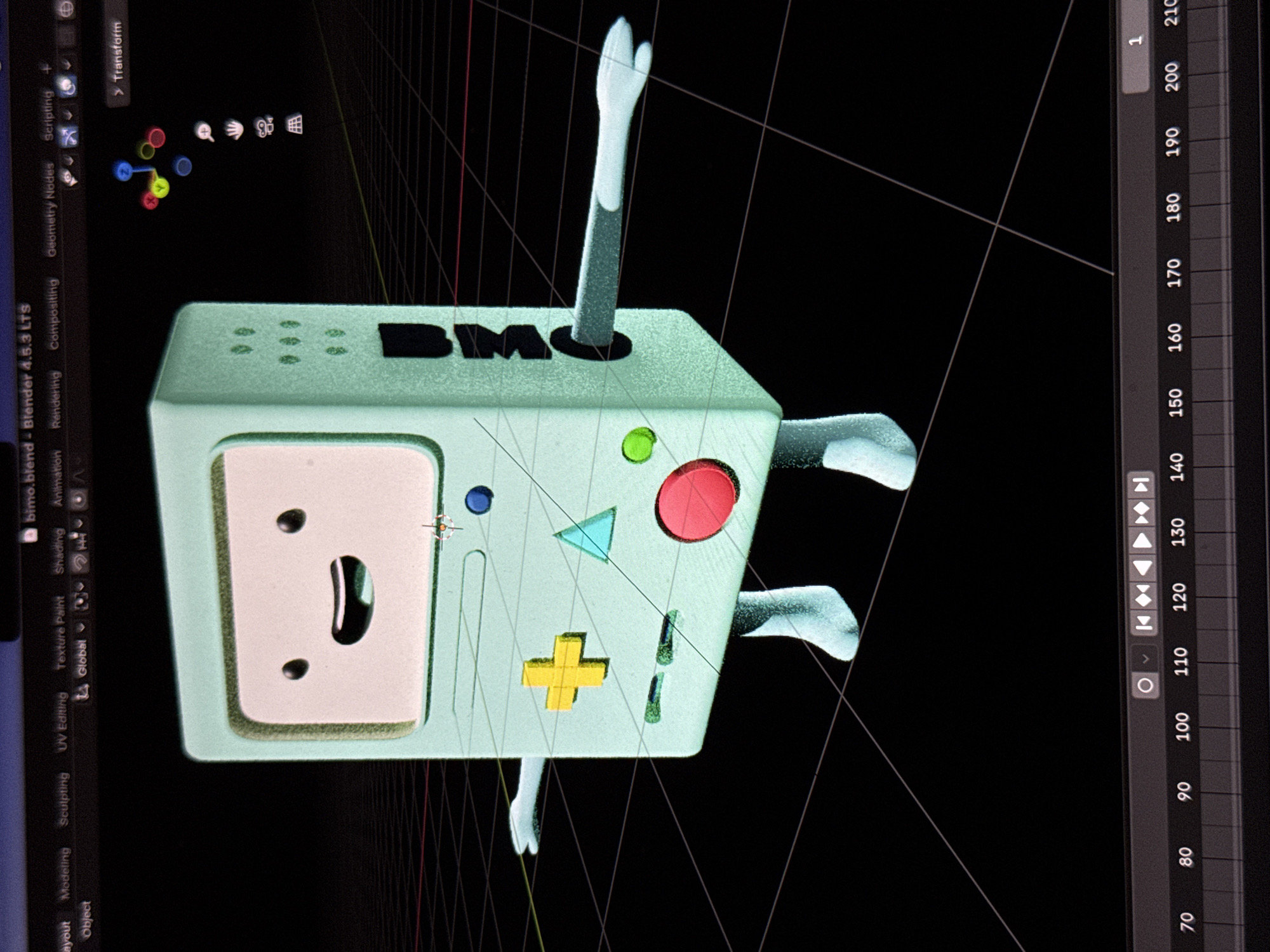 - "The image displays a computer screen showing a 3D model of BMO from Adventure Time in Blender 4" by FM-svv4s2, licensed under CC BY 4.0