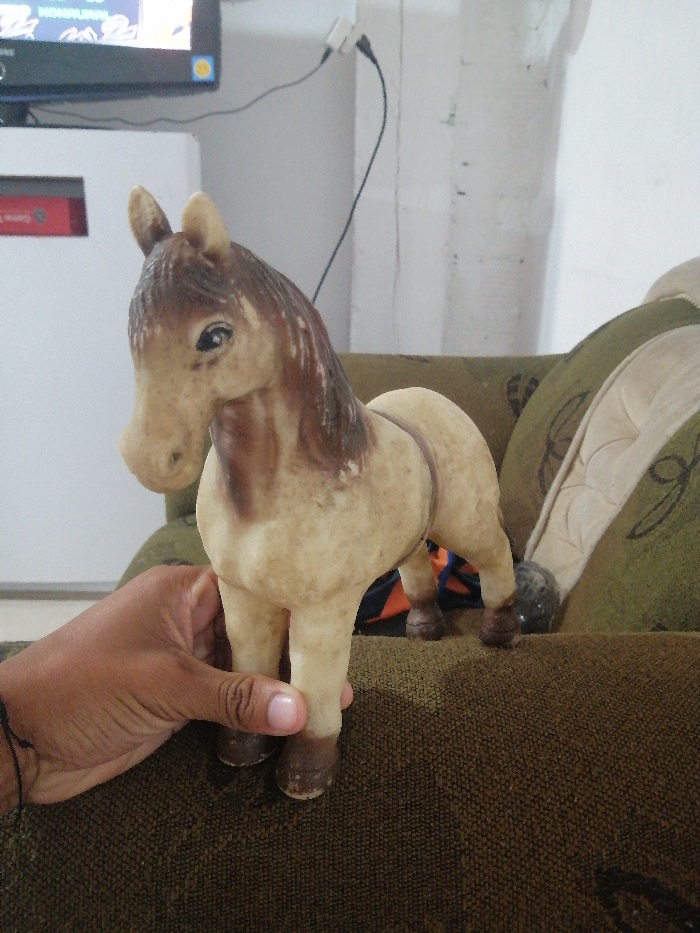 A person holds a decorative horse figurine. The horse is beige with a brown mane and lower legs. It stands on a brown, textured couch beside a green pillow with a quilted design. In the background is a white wall and a white appliance topped with a television. Electrical cords run from the appliance to the wall.