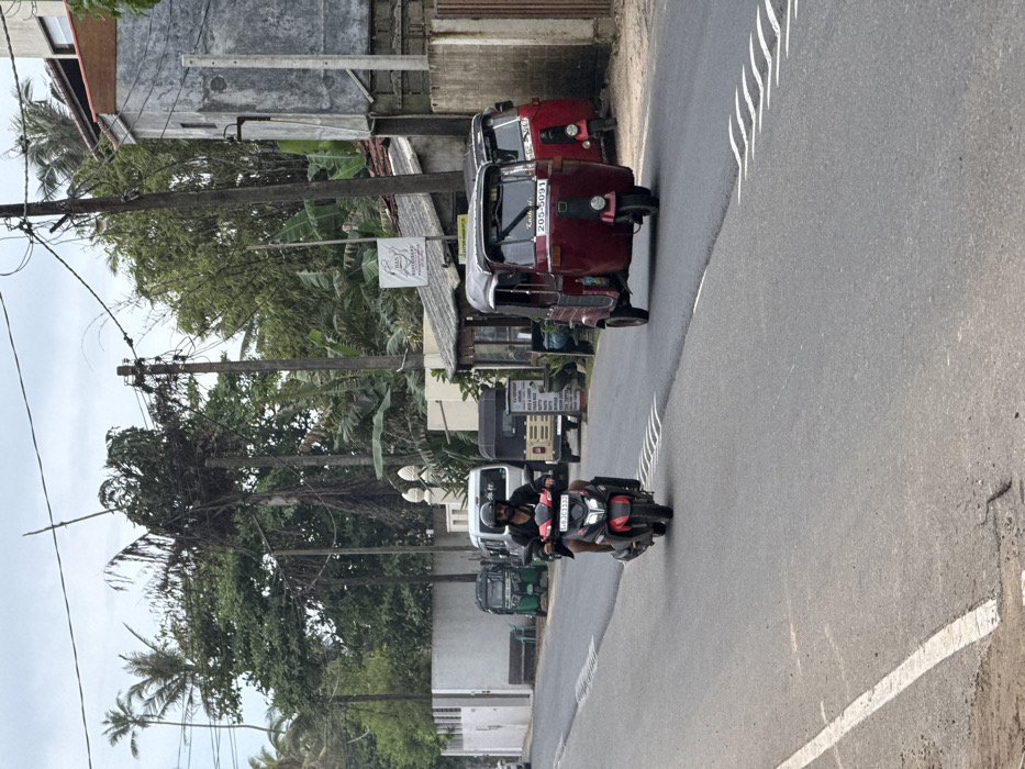 A street scene shows a motorbike with two riders traveling on the right. Behind them are several auto-rickshaws (tuk-tuks) parked or moving slowly. Lush green trees and utility poles line the left side of the road. Buildings are visible in the background, with one featuring a sign. The road has a dividing line and a white marking near the right edge. The sky is overcast.