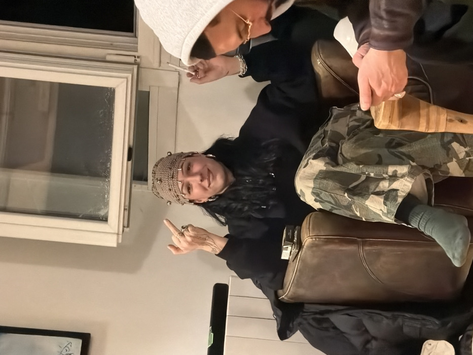 This image captures an indoor scene located in the city of Saint-Denis, France, featuring two individuals. In the foreground, centered, an individual with long dark hair, wearing a black hooded sweatshirt, camouflage cargo pants, and teal-colored socks, is seated in a brown leather armchair. A light brown knitted head covering adorned with silver studs and dangling pins is worn on their head. This individual is looking directly at the camera, displaying the middle finger of their right hand in an upward extended position. Multiple rings are visible on this hand, along with a dark pattern, consistent with a temporary dye or tattoo, on the back of the hand. The left hand holds a lit cigarette. Silver hoop earrings are visible. To the right, a second, partially visible male individual, with a beard and gold-rimmed eyeglasses, is seated. He wears a light grey hooded sweatshirt and a dark jacket, and is observed looking downwards, manipulating a small white object with both hands. His left hand also holds a lit cigarette, and multiple silver bracelets are visible on his left wrist. The background consists of a light-colored wall and a large white-framed window, through which a dark exterior is visible. A dark quilted jacket is draped over the left armrest of the armchair. A pack of cigarettes rests on the right armrest. To the far left, a dark rectangular device sits on a white ledge, below a small framed artwork mounted on the wall. The scene is illuminated by interior artificial lighting.