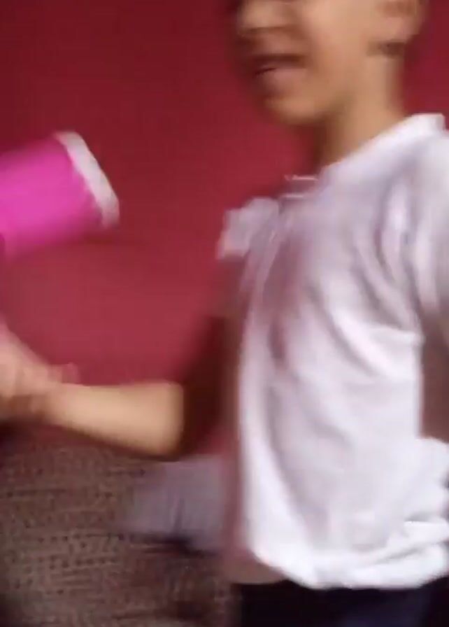 A young boy wearing a white t-shirt and blue shorts is facing the camera. He is in front of a red wall and the video seems to be taken in a room. He is smiling and appears to be speaking. There is a table or shelf behind him with various items on it. The video is slightly shaky and blurred at times.