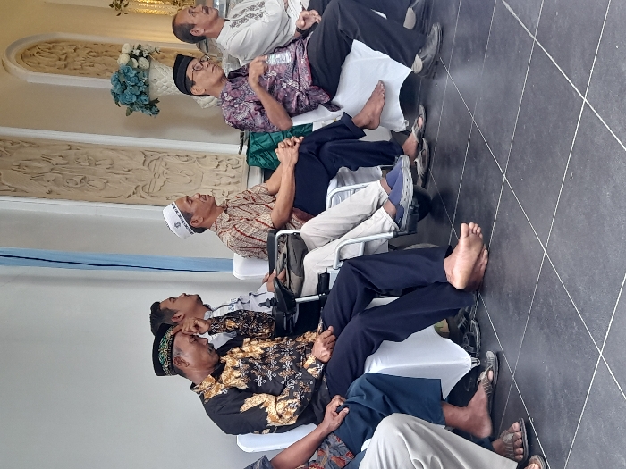 Five men are seated on chairs in an outdoor space. The scene is located in Kecamatan Buduran, Indonesia (latitude: -7.432, longitude: 112.697). The man in the center is wearing a patterned shirt and a white hat. He is seated with his feet resting on the ground. The man to his left is wearing a dark patterned shirt. He is seated with his left foot resting on the ground. The man to his right is wearing a dark shirt with a white collar. He is seated with his legs crossed. The man to the far right is wearing a dark patterned shirt. He is seated with his feet resting on the ground. The man on the left is wearing a black shirt with a white collar. He is seated with his left foot resting on the ground. All of the men are looking in different directions. The chairs are white and are placed on a black tiled floor. The environment appears to be a patio of a residence or place of business. There is a potted plant to the right of the scene. The walls of the building are white and there is a partially visible blue curtain hanging from the top of the image. The scene is lit from above by natural sunlight. The men appear to be having a casual conversation or possibly an informal meeting. There are no visible signs of any distress or urgency.