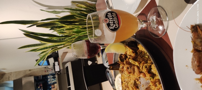 A dining table displays a feast. Beer in a glass with the "Estrella Galicia" logo sits near a glass of red wine and a slice of lemon. A black pan holds paella with visible mussels. Next to it, a white plate presents prawns. A decorative plant adorns the left side. The overall impression is a colorful and appetizing meal.