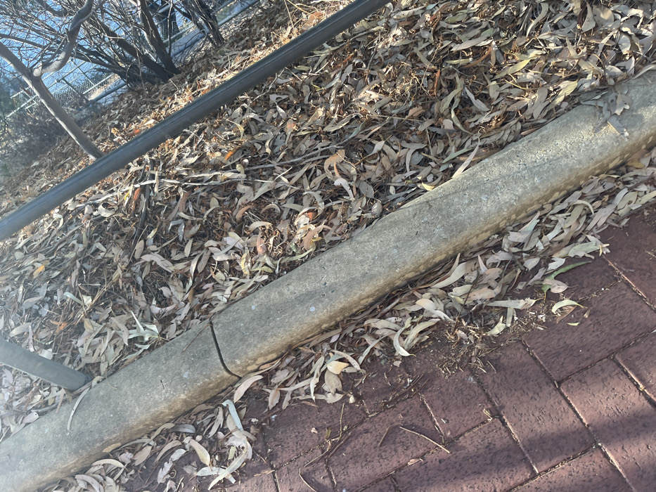 The image captures an outdoor ground-level scene in Applecross, Australia. On the left, a section of red brick paving is visible, arranged in a pattern. Adjacent to this, extending diagonally across the frame, is a weathered concrete curbstone, exhibiting a distinct vertical crack or joint in its upper surface. To the right of the curbstone, the ground is densely covered with dry, elongated leaves, twigs, and small branches, consistent with eucalyptus debris. In the upper right quadrant, dark metal posts or railing components are present, with a chain-link fence partially visible behind them. Beyond the fence, bare tree branches are silhouetted against a clear blue sky. The scene is illuminated by strong, direct sunlight. No individuals or specific actions are depicted.