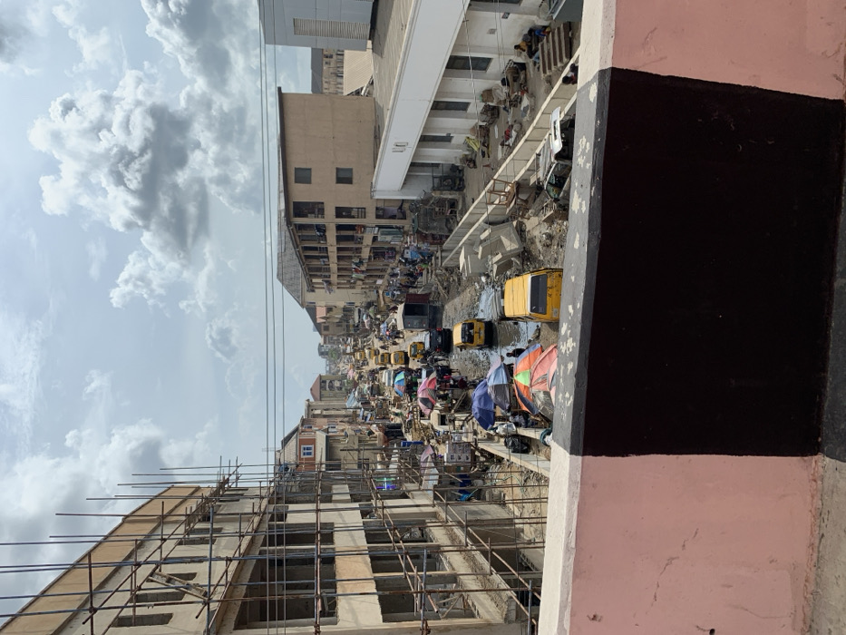 An elevated view captures a bustling street scene in Ebute-Metta, Nigeria, under an overcast sky. In the foreground, a concrete barrier, half painted pink and half black with a white stripe, frames the bottom of the image. The street below, appearing unpaved and irregular with visible puddles and debris, is densely populated with people and vehicles. On the left, a multi-story building is under active construction, encased in extensive metal scaffolding. Beneath this structure, numerous market stalls operate, identified by varied tarpaulins and large umbrellas, with pedestrians moving between them and the roadway. The roadway itself is occupied by multiple yellow commercial minibuses (danfo), dark-colored cars, and at least one white truck, some appearing stationary, others in motion. Concrete drainage elements or barriers are visible along and within the street, indicating ongoing infrastructure work or disarray. On the right side of the street, a light-brown, multi-story residential building with multiple balconies stands, followed by a modern, flat-roofed white building. The area adjacent to these buildings along the street is cluttered with construction materials, debris, and what appear to be makeshift vendor setups or storage areas. Several individuals are visible in these areas, some sitting. A partially stripped vehicle, possibly a sedan, is observed near the white building. The street recedes into the distance, maintaining its congested character with a continuous presence of vehicles and people, extending to the horizon where additional structures are vaguely visible.