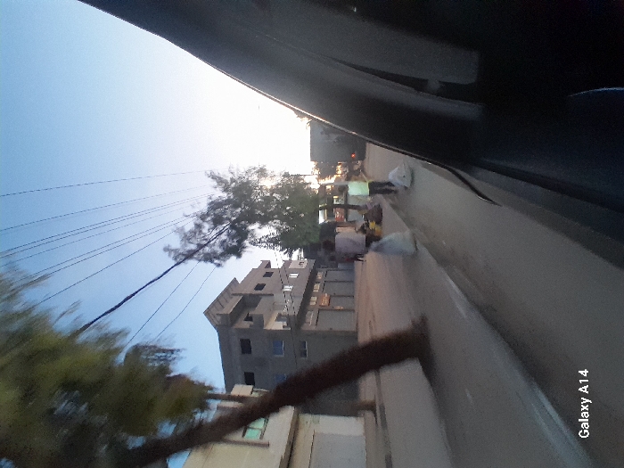 A street scene is captured from inside a vehicle. Power lines stretch across a light blue sky. A building under construction is visible along with a tree. People are walking on the sidewalk next to the street. Part of the vehicle's interior frames the shot on the top and right, adding a sense of perspective. The image includes the watermark "Galaxy A14."