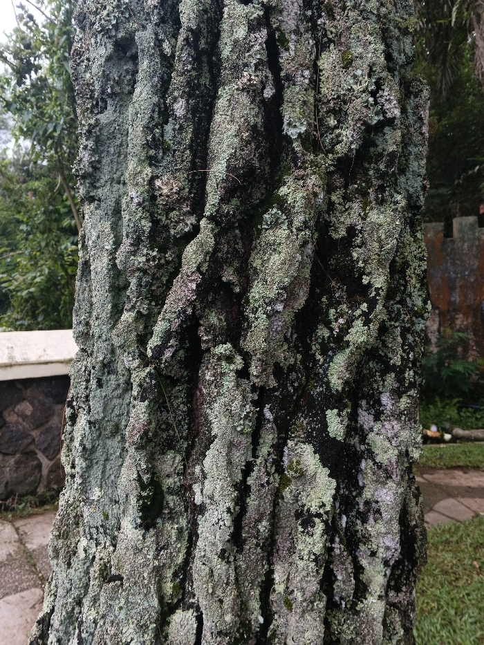 A close-up reveals a tree trunk heavily textured with deep furrows and ridges. The bark is predominantly gray, overlaid with a mottled pattern of green lichen. Fine tendrils or threads of organic material are visible against the bark's surface. Background elements include blurred foliage, a stone wall, and hints of a paved area, placing the tree in a natural setting.