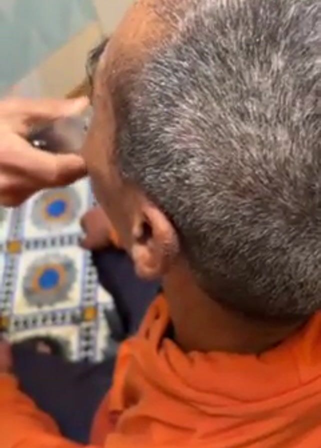 person in an orange sweatshirt getting a haircut. The haircut is being given by someone whose hands are visible, using an electric razor. The person getting the haircut has graying hair and thinning hair on the top of their head. The background includes a patterned rug and a glimpse of a light-colored wall. The camera is positioned to the side of and slightly above the person receiving the haircut.