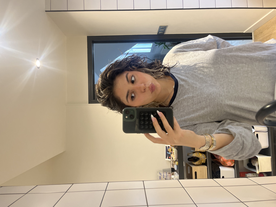 An indoor mirror selfie captures a young adult female in what appears to be a residential setting in Paris, France