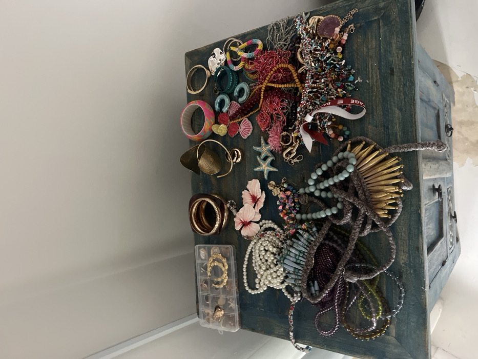 - "The scene depicts a static, detailed view of a large collection of costume jewelry and accessories displayed on the distressed wooden top of a small chest of drawers, located in what appears to be an indoor setting in Pecatu, Indonesia" by FM-WyDEJ3, licensed under CC BY 4.0