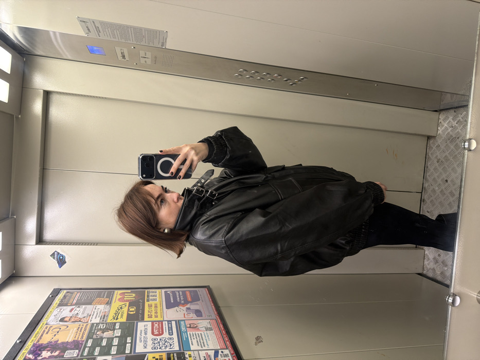 A female subject is depicted taking a mirror selfie inside an elevator in Ust-Ilimsk, Russia. She is positioned facing a mirror that covers the lower portion of the elevator wall. The subject has shoulder-length brown hair and is wearing an oversized black leather bomber jacket with prominent buckles on the collar and dark trousers. A light-colored circular stud earring is visible on her left ear. She holds a dark-colored smartphone with a circular magnetic attachment on its back in her right hand, pointed towards the mirror to capture her reflection. Her fingernails are painted a dark shade. The elevator interior features light grey metal walls and a silver-colored textured metal floor. A bulletin board on the left wall (viewer's left) displays multiple flyers and posters with Cyrillic text, including the city name "Усть-Илимск" and advertisements. A small, blue-winged sticker is affixed to the wall above the bulletin board. On the right wall (viewer's right), a brushed metal control panel contains several silver circular buttons arranged vertically, along with a blue illuminated display indicating "1" as the current floor. Cyrillic text, including "лифт" (lift), and safety information are visible on this panel. The ceiling contains recessed rectangular light fixtures. The elevator door, consistent with the wall material, is closed behind the subject.