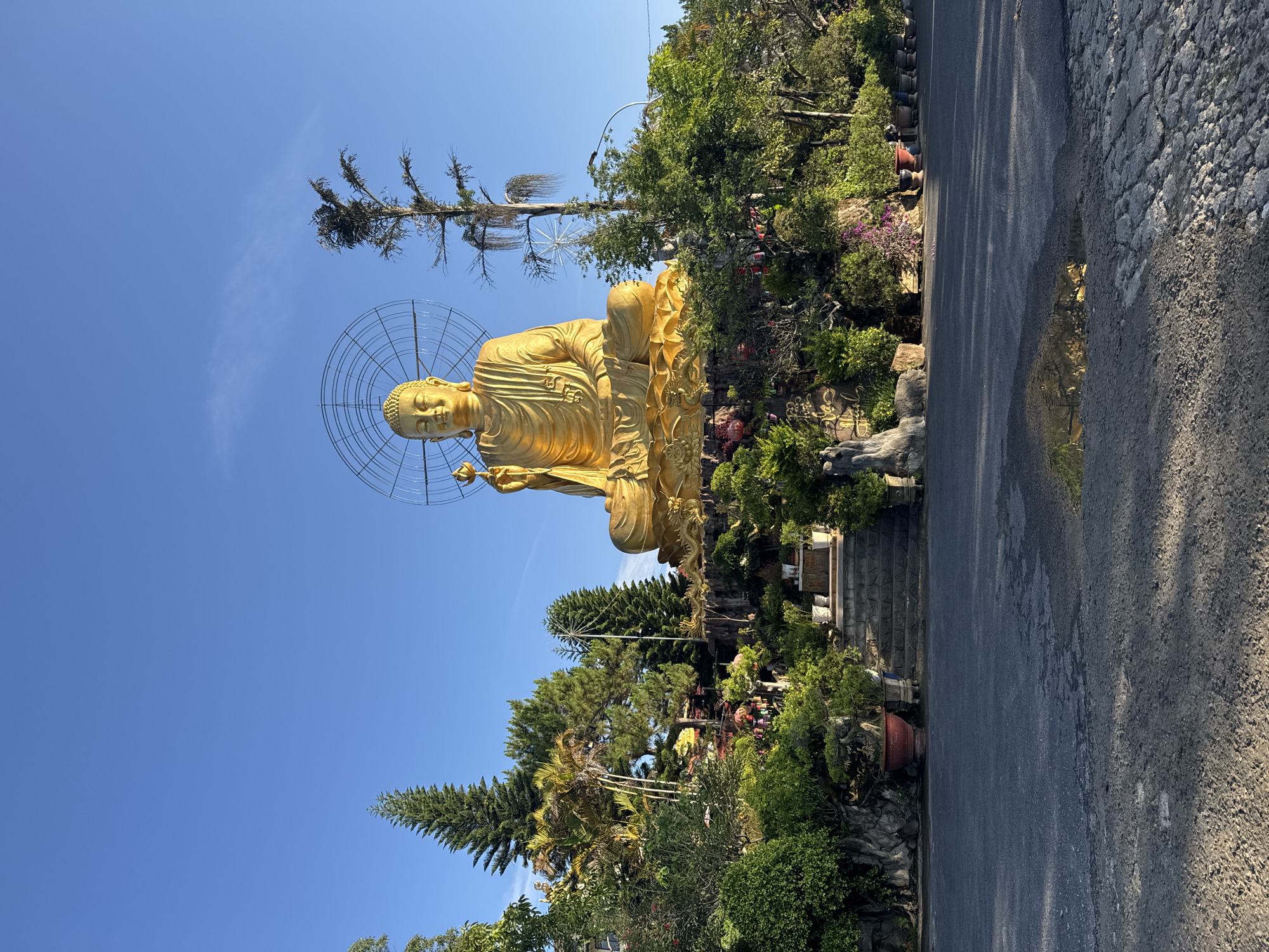 A wide-angle, low-angle view shows a large golden Buddha statue in Lâm Viên - Đà Lạt, Vietnam. The statue is seated in a lotus position and appears to be amidst a lush garden with varied plants and trees. The clear blue sky is visible behind the statue. A road runs along the right side of the frame, with vegetation separating it from the statue. There are steps leading up to the statue's platform. A large halo-like structure surrounds the head of the Buddha.
