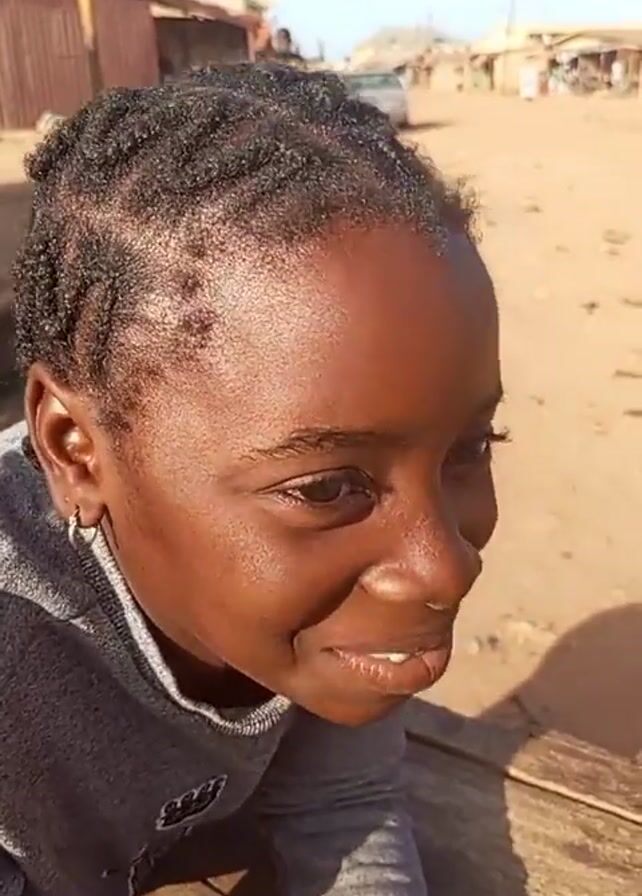 young Black girl smiling at the camera. She is wearing a gray long-sleeved shirt and small hoop earrings. Her hair is styled in braids. The background shows a dusty outdoor setting with buildings and a dirt road. The girl is lying on what appears to be a wooden surface. The video seems to be taken on a sunny day.