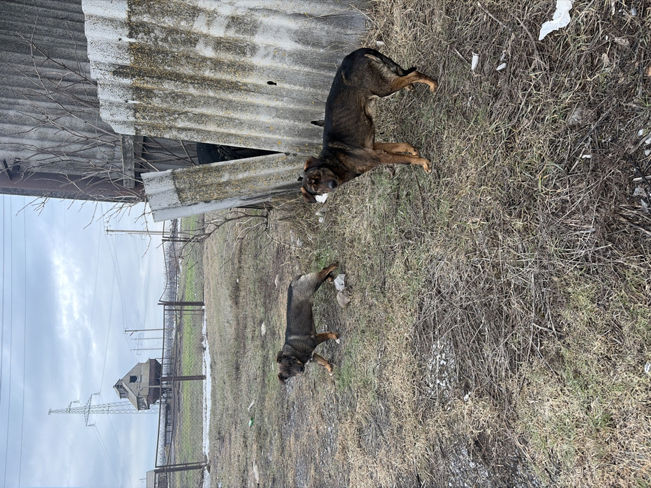 The scene depicts an outdoor environment in Bessergenovka, Russia, under an overcast sky. The foreground is an expanse of sparse, dry brown and green grass, mixed with patches of bare soil and scattered debris, including small white plastic fragments and a green bottle cap. Two medium-sized dogs are present. The dog on the left is dark brown with lighter tan markings on its legs and face, standing in profile facing left, with its right front paw slightly raised. The dog on the right, similar in coloration, stands facing forward and slightly left, with its left ear partially flopped. To the right of the frame, two large, weathered, broken corrugated sheets, consistent with fiber cement or asbestos, lean against a dilapidated structure, partially obscuring it. Bare tree branches are visible behind and above these sheets. In the mid-ground, a chain-link fence extends horizontally across the frame. The far background features an elevated industrial structure, resembling a grain silo or processing plant, constructed of metal and appearing weathered. Adjacent to it on the left is a tall metal lattice power transmission tower. Multiple power lines and utility poles are visible against the cloudy sky, stretching across the horizon.