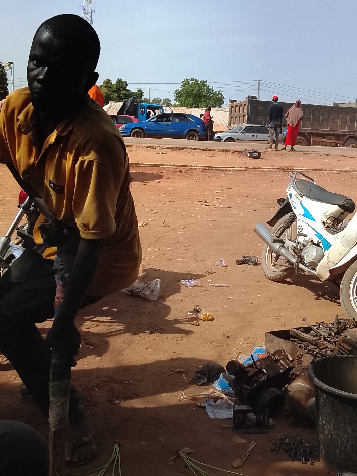This image depicts an outdoor scene in Katcha, Nigeria, characterized by reddish-brown dirt ground under a clear, bright sky. In the left foreground, a dark-skinned male subject, heavily shadowed, wears a mustard yellow short-sleeved collared shirt and dark trousers. He is partially obscured, appears to be seated or crouching, and is looking towards the left. His right arm is holding a vertical metal object, possibly a handlebar, while his left arm, wrapped with a light-colored material, is bent. His left foot, wearing a sandal, rests on the dirt ground where several bundles of green, flexible strands are present. The midground features an uneven dirt surface with scattered debris including plastic wrappers and small discarded items. To the right, a white and blue motorcycle with a visible exhaust pipe is parked. Below it, a collection of engine parts, a metal tray filled with nuts and bolts, and a black plastic bucket are arranged on the ground, suggesting a repair area. In the background, a street or road is visible with several vehicles and individuals. From left to right: a blue sedan, a blue pickup truck, another light-colored sedan, and a large brown dump truck. Near the vehicles, several people are standing; notably, two individuals are positioned near the brown dump truck—one in a dark shirt and red cap, and another in a light brown head covering and a long red garment. Green foliage is visible behind the vehicles on the left, and a utility tower extends into the sky on the far left background. Distinct shadows are cast across the scene, indicating strong daylight.