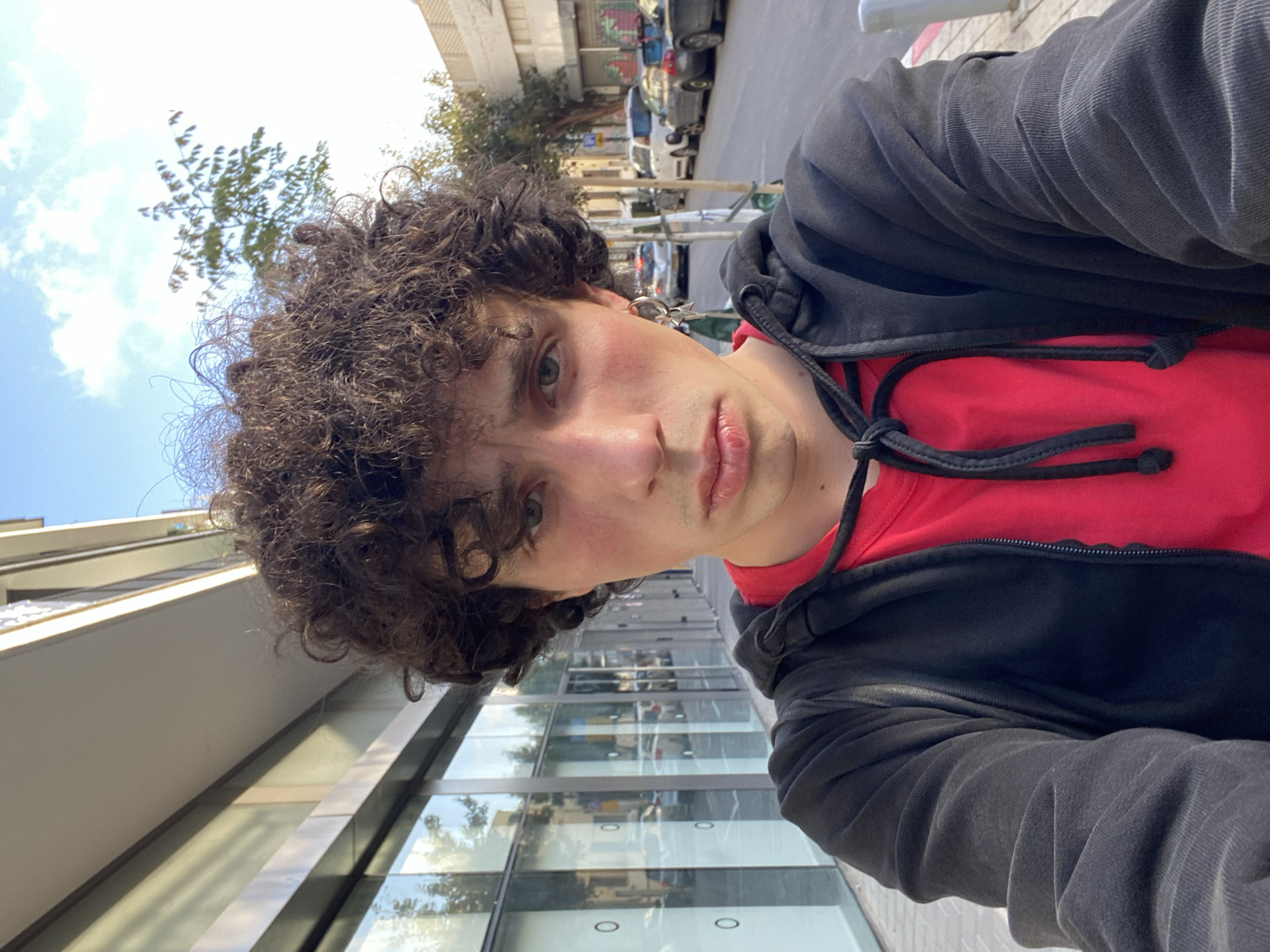A person with curly hair is wearing a red shirt underneath a black hoodie with drawstrings. The person is standing outside a building with a glass facade in a sunny location. In the background is a street with parked cars. The scene is likely in Tel-Aviv, Israel.
