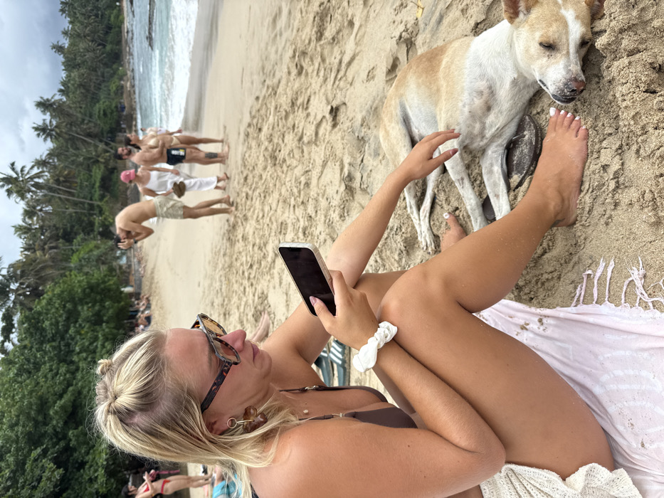 A woman in sunglasses and a brown bikini top uses her phone on a sandy beach. Her legs are extended, with a white scrunchie on one wrist. A white and tan dog rests its head near her bare feet. In the background, several people stand near the water, including a group of shirtless men. Palm trees and lush greenery are visible along the shoreline.